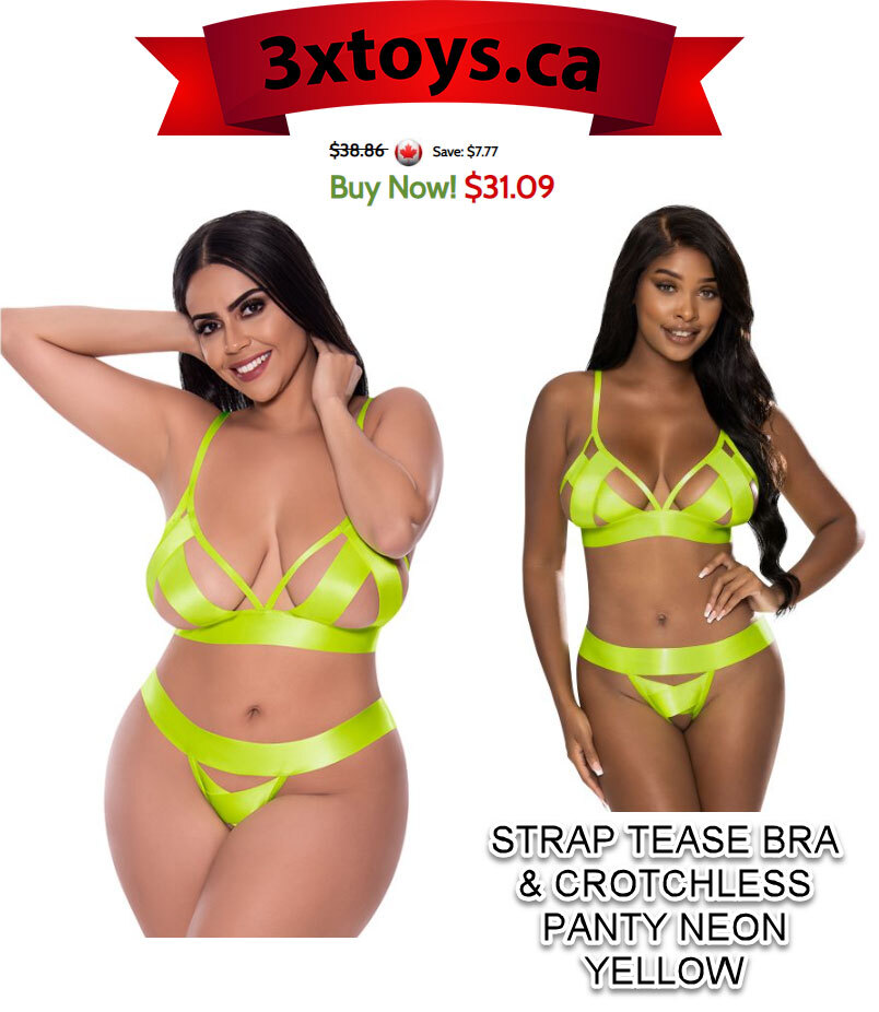 Strap Tease Bra and Crotchless Panty Neon Yellow 2XL from Magic Silk Lingerie. Magic Silk Strap Tease Bra and Crotchless Panty Set Yellow 2XL Extra Large. From the Exposed Lingerie Collection by Magic Silk Collection, this style includes: a bra featuring thick bondage style strappy bra cups, adjustable shoulder straps with metal sliders, O-ring details, a hook and eye closure at the back, and a matching crotchless panty. Plush Satin elastic straps with a slight sheen in electrifying color. Size ladies plus size 1X/2X. Dress sizes 20 and 22. Exposed by Magic Silk they are not just silk anymore. Fabric content 90% Nylon, 10% Spandex.